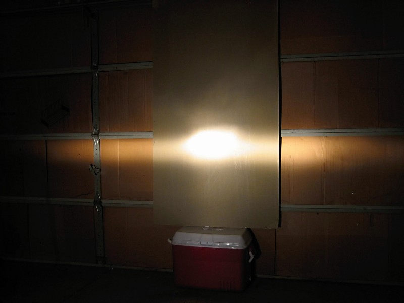 Sealed Beam: Sylvania Silverstar H4656ST Sylvania XvraVision H6024 Koito H4652 Wagner (No Part Number) H4 AutoPal HL-106 H4 Hella Free Form (totally clear lens) Cibie 082395 The Koito and the Wagner were on my FJ62 when I purchased it two years ago, so this test may not be fair to them because they have been used an unknown amount of hours. But, I threw them in the test just for comparison purposes. My camera automatically adjusts the aperture opening to brightness, so the relative brightness of the various headlights is not accurate in these pictures. The pictures serve to show the light pattern. The digital light meter is used to determine relative brightness. In the pictures, the more of my ugly garage door with the cheepo cardboard insulation you can see above the hot spot, the more oncoming drivers will be blinded by the headlight. So here we go with the pictures (LO beam first, HI beam second): SECTION 1--SEALED BEAM Sylvania Silverstar H4656ST Notice the amount of stray light above the hot spot of the LO beam picture. This will appear as glare to oncoming drivers. It is interesting that with two of the three sealed beam rectangular headlights, the HI beam had less light intensity than the LO beam, it's just aimed higher and in some cases a little to the left. Also notice that the SilverStar has a whiter light than all of the other headlights. LUX: LO=49 HI=36 LOW BEAM ![]() HIGH BEAM ![]() -------------------------------------------------------------- Sylvania XtraVision H6024 This is the only round headlight I had to test. There is stray light above the hot spot, but not as much as the SilverStar. Also the intensity of the light is higher than any of the rectangular sealed beam headlights, probably due to the round vs. rectangular design. LUX: LO=63 HI=77 LOW BEAM ![]() HIGH BEAM ![]() --------------------------------------------------------------- Koito H4652 Notice the stray light above the hot spot. I don't believe this headlight is available, but I decided to show it because some vehicle lighting web sites that I have seen have high praise for Koito lights. I didn't see any visible superiority. In fact, the light pattern is very similar to the Sylvania Xtravision. LUX: LO=49 HI=41 LOW BEAM ![]() HIGH BEAM ![]() --------------------------------------------------------------- Wagner (no part number on the light) This headlight is terrible on LO beam. Notice how much of the garage door it lights up. LUX: LO=25 HI=26 LOW BEAM ![]() HIGH BEAM ![]() --------------------------------------------------------------- SECTION 2--H4 All of the following headlights are H4 headlights. The exact same light bulb was used to test each headlight housing and is an AutoPal 60/55W H4 lamp. AutoPal HL-106 H4 I bought this headlight on ebay. This headlight is very inexpensive compared to the other H4 headlights that I tested. You can see that the vertical cutoff is fuzzy and not much better than the sealed beam headlights. The low light intensity indicates a poorly focused beam. Both the Cibie and the Hella have much higher light intensity using the exact same bulb. LUX: LO=39 HI=87 LOW BEAM ![]() HIGH BEAM ![]() --------------------------------------------------------------- Hella Free Form (the one with the totally clear lens) This headlight had more stray light above the hot spot than you can see in the pic. Because the hot spot has more intensity, the camera aperture closes some and you can't see the stray light very well. What is interesting is that using the exact same bulb in the Hella as in the AutoPal gives a significantly higher intensity hot spot in the Hella. This is due to the headlight housing doing a better job of focusing the light. LUX: LO=55 HI =117 LOW BEAM ![]() HIGH BEAM ![]() --------------------------------------------------------------- Cibie 082395 This is the headlight I have in my FJ62. You can see the sharp vertical cut off with the LO beam and the even distribution of light below the cut off line. There is very little stray light above that straight cut off line. This headlight is top shelf. Get it here. LUX: LO=55 HI=113 LOW BEAM ![]() HIGH BEAM ![]() |