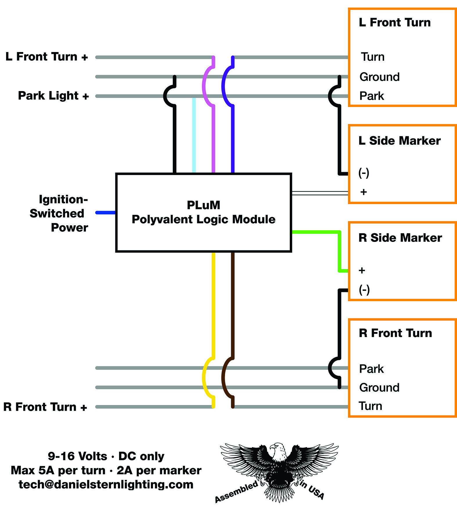 The PLUM-4 polyvalent logic module adds fully automatic daytime running light (DRL) functionality to a vehicle's front turn signal lamps by operating them steadily when the engine is running, the parking brake is released, and the parking/tail lamps or headlamps are switched off. The turn signals still work normally; when the DRLs are on, signalling for a left turn (for example) will flash the left turn signal while the right one remains steady-lit, still providing the DRL function. Activating the hazard flashers (4-way flashers) overrides the DRL function; the turn signals on both sides of the vehicle will flash—all just like a factory installation. This DRL implementation complies with US and Canadian DRL requirements, and has major advantages over headlamp-based DRLs. Because directional signals are legally required to shine light in a wide range of horizontal and vertical angles, the DRLs are likewise visible from a wide range of viewing angles for maximum conspicuity and safety benefit in avoiding angular collisions with pedestrians, bicyclists and other motorists. Turn signal bulbs cost much less, consume much less power and have a much longer lifespan than headlight bulbs. There is no undue glare with turn signal DRLs, as can be a problem with headlamp-based DRLs. And, it's much harder to forget to turn on your full lights at night, because the DRL color is amber rather than white so you don't see misleading reflections of your "headlamps" (actually your DRLs) in shiny surfaces after dark. The PLUM-4 is all-new, and vastly improved over the previous-type